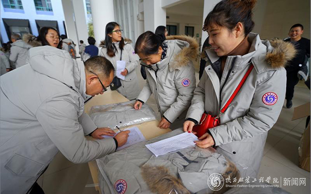 在E区教学楼大厅,在校董事长吕明等领导主持下,全校教职工换上了统一的羽绒服,彰显了学校的人文关怀。特别是左臂上的陕服校徽标志让陕服形象更加绚丽夺目。