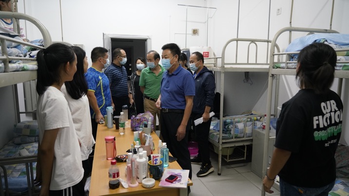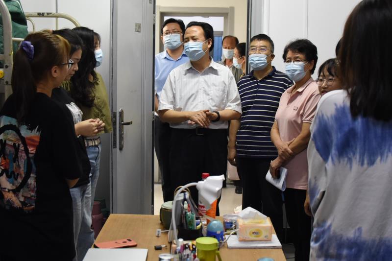 晚上7:00,校长张义明、党委书记温锋、常务副校长李望国、副校长吴俊林、李宗领、温小郑、唐明晰带领党政办、学生处、招生办等职能部门负责人、各二级学院院长、2020级本科辅导员深入宿舍楼看望新生。校领导首先向新生表示祝贺,祝贺他们成为光荣的大学生,然后详细询问学生的饮食、起居问题,叮嘱他们做好疫情防控工作,做好个人防护,希望大家尽快调整心态,尽快融入陕服大家庭,尽快适应大学生活,刻苦学习,不负青春,学到一身本领为祖国建设做贡献。校领导还叮嘱辅导员和宿管要像关心自己的亲人和孩子一样关心新同学,解决他们的实际困难,为他们创造一个舒心的生活环境。