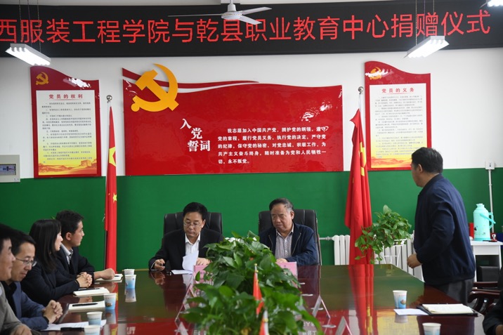捐赠仪式上,王军战副县长致辞。他简要回顾了县校结对帮扶以来,双方开展的工作及取得的成效,代表县政府向陕西服装工程学院表示诚挚的谢意!希望通过本次活动,进一步加大双方合作力度,做细做实结对帮扶各项工作,为乾县脱贫攻坚贡献力量;县教育局要进一步提高认识,抓好落实,加大宣传报道结对帮扶的新进展、新成效,营造良好的舆论氛围;县职教中心要充分借助陕服技术、信息、人才等方面优势,积极推动全县职教事业和县域经济社会事业发展。随后,校工会主席刘明夫、乾县职业教育中心常务副校长何战会签订捐赠协议。最后,温锋书记代表学校讲话。温书记对县政府、县教育局、县职业教育中心领导对我校教育扶贫工作的认可和支持表示感谢;简要通报对我校建设发展、人才培养、专业建设及推进教育扶贫、消费扶贫工作情况。希望校县双方携手并进,切实把陕服的优质教育资源和县域的优势结合起来,致力于为乾县经济发展提供人才、技术、培训等有力支撑,助推乾县经济、社会、教育、科技发展与进步,为乾县打赢脱贫攻坚战贡献陕服力量。