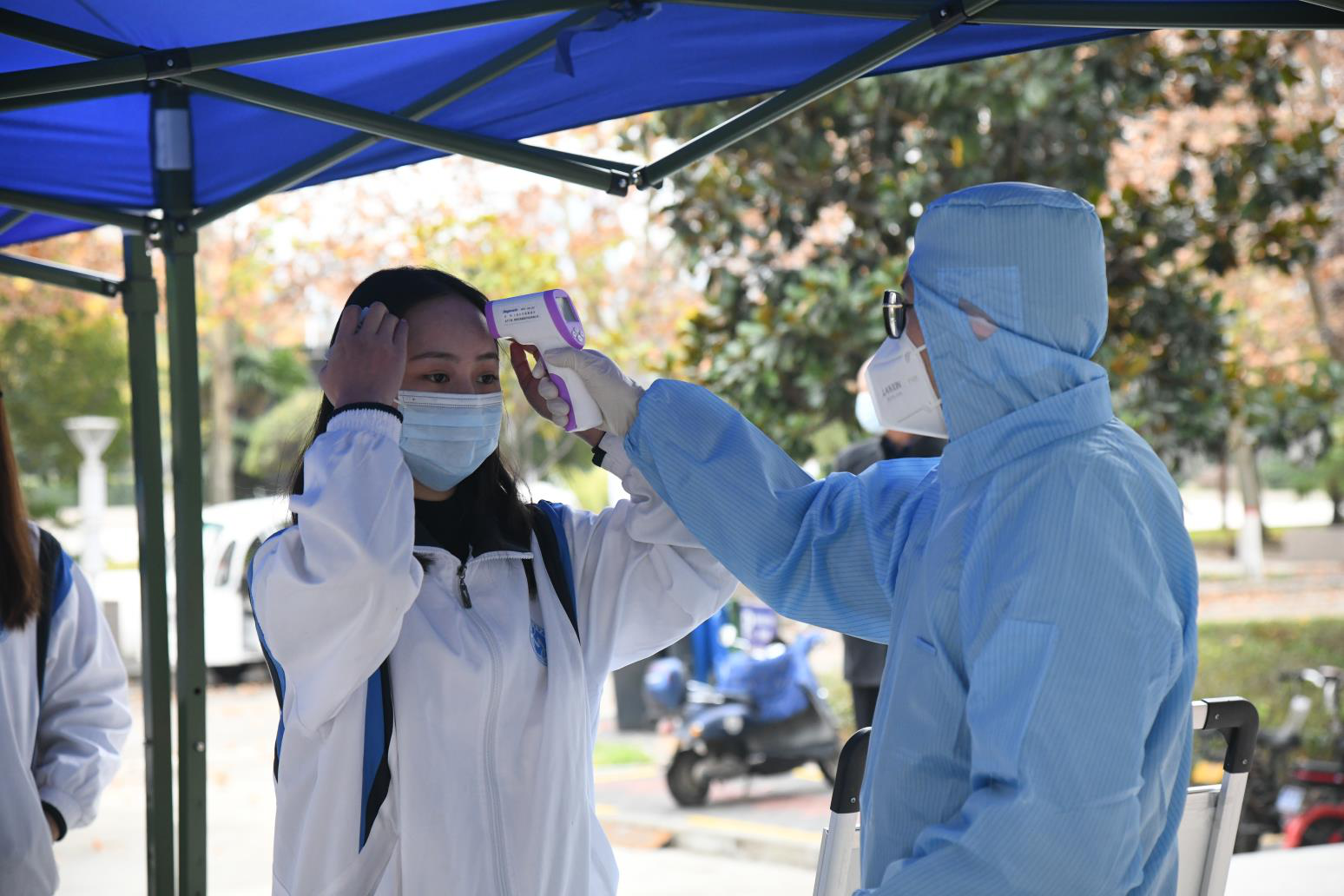 演练现场按照疫情防控要求分别设置了等候区、测温区、信息录入区、采样与信息绑定区、样本收集区、医疗垃圾处理区、出口、待命区、临时隔离区等区域。采样队伍由部分辅导员、校卫生所医务人员组成,由专人引导核酸检测人员分3个采样点同步进行咽拭子采集。被检人员按顺序间隔一米排队,依次有序接收咽拭子采样。整个过程采集人员规范穿脱防护用品用具、严格落实医废处置,采集结束后对现场进行了再次消杀。