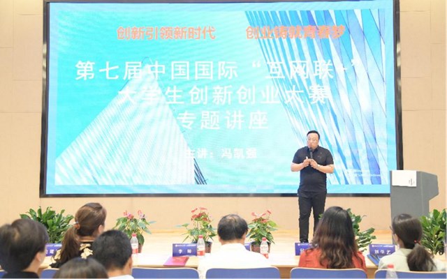 结合团队指导“互联网+”赛事获奖项目作创业实践与参赛经验分享。他主要介绍了互联网+创赛的发展及第七届中国国际“互联网+”大学生创新创业大赛的新变化、评审规则以及内容要点,整个分享娓娓道来、令人激情澎湃,使参会师生大受启发。