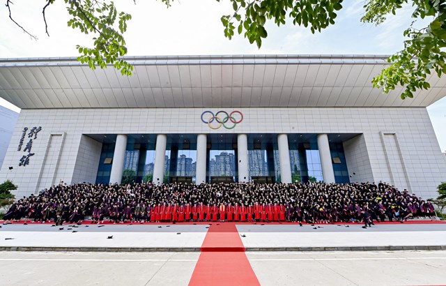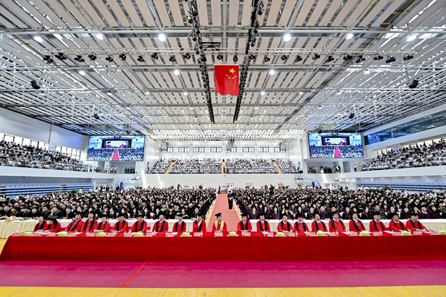 陕服千亩校园花团锦簇,一派节日气氛。上午9时,毕业典礼暨学位授予仪式在现代化多功能复合型的陕西服装工程学院体育馆中央演播大厅举行。