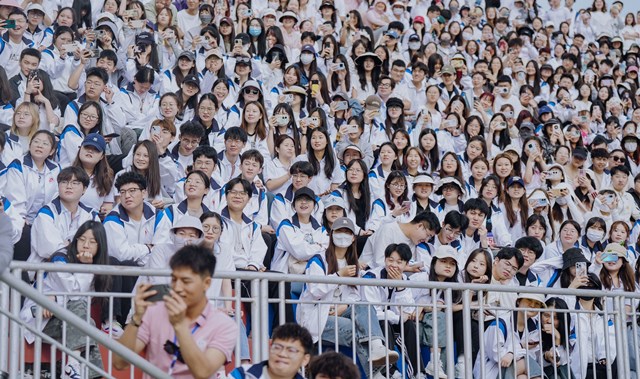 上午8时,可容纳万名师生的田径体育场座无虚席,到处欢声笑语,气氛十分热烈。在欢快的乐曲声中,镐京集团董事局主席吕明博士及校党政领导班子成员走上主席台,向师生挥手致意,全场响起长时间的热烈掌声。