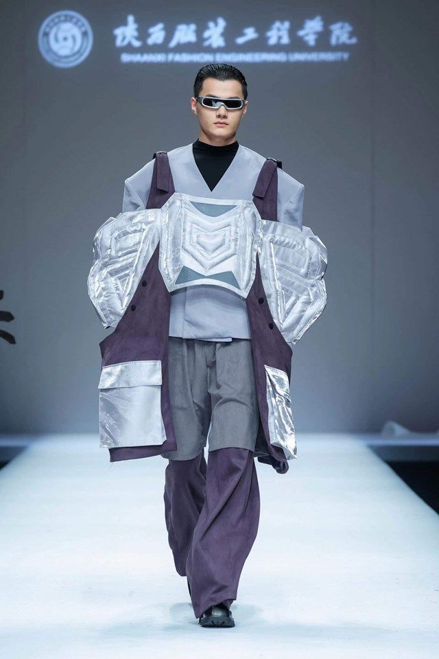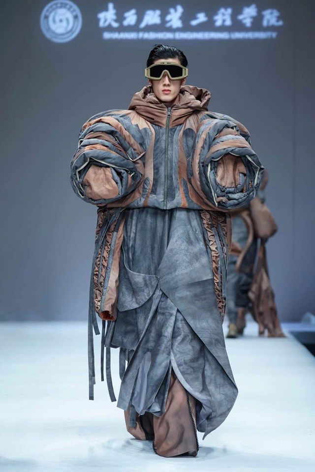 长安,即今天的西安,是古丝路起点,它链接了中西方不同的思想。我校隶属于十三朝古都西安,坐落在丝路源起,这座古老的城市给予我们珍贵的文化精粹。此篇章的毕业设计中,选取具有陕西地域代表性的皮影、兵马俑、剪纸等文化符号,运用数码印花、滴胶技法、激光切割、镂空工艺、戳戳乐技法等,辅以现代服饰的轮廓造型进行创新设计。敦煌,丝路的必经一站,它不仅是丝路上的重要节点,同时也是东西方文化交流的里程碑,其中孕育着丰富的壁画内容和生动的传统故事。这个篇章中的毕业设计作品来源于敦煌壁画中丰富的图案题材。例如将藻井纹样、忍冬纹样、缠枝纹样等传统图案元素,结合当下服装机能风格、休闲风格、运动风格等风格服装款式,进行解构设计,在服装色彩中将无色系和有色系进行碰撞,呈现出传统文化元素与现代设计元素的对比效果。在服装局部细节工艺设计中,利用抽绳、编结、抽褶等工艺手法,借助拼接绗缝工艺手法,设计出极具时尚感的现代服饰。