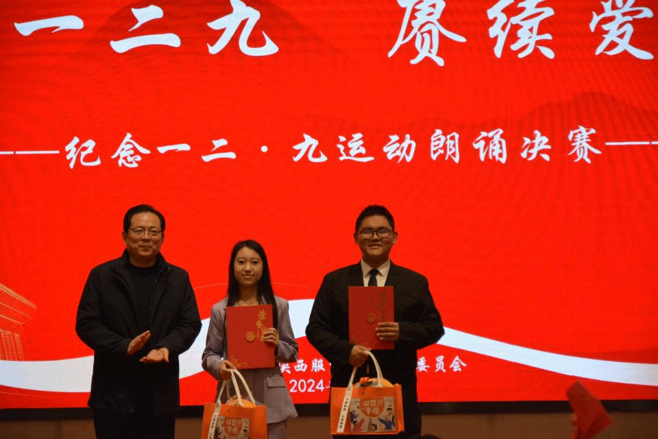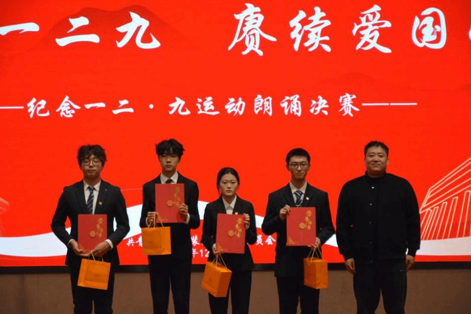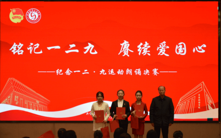 以青春之名,书写诚挚热爱,以心中红星,献礼盛世中华。为深入学习贯彻习近平新时代中国特色社会主义思想,增强广大师生的爱国意识,引导青年继承革命传统,弘扬爱国主义精神,纪念“一二·九”运动八十九周年。12月9日19:00,“铭记一二九,赓续爱国心”纪念一二·九运动朗诵比赛于E1-4报告厅顺利举行。校党委书记王岗老师,党委副书记、纪委书记刘继兵老师以及各二级学院党委(党总支)副书记,团委书记、副书记出席了本次活动。高岚老师、魏丹娜老师、李亚倩老师、王静老师、李楠老师担任本次比赛评委。