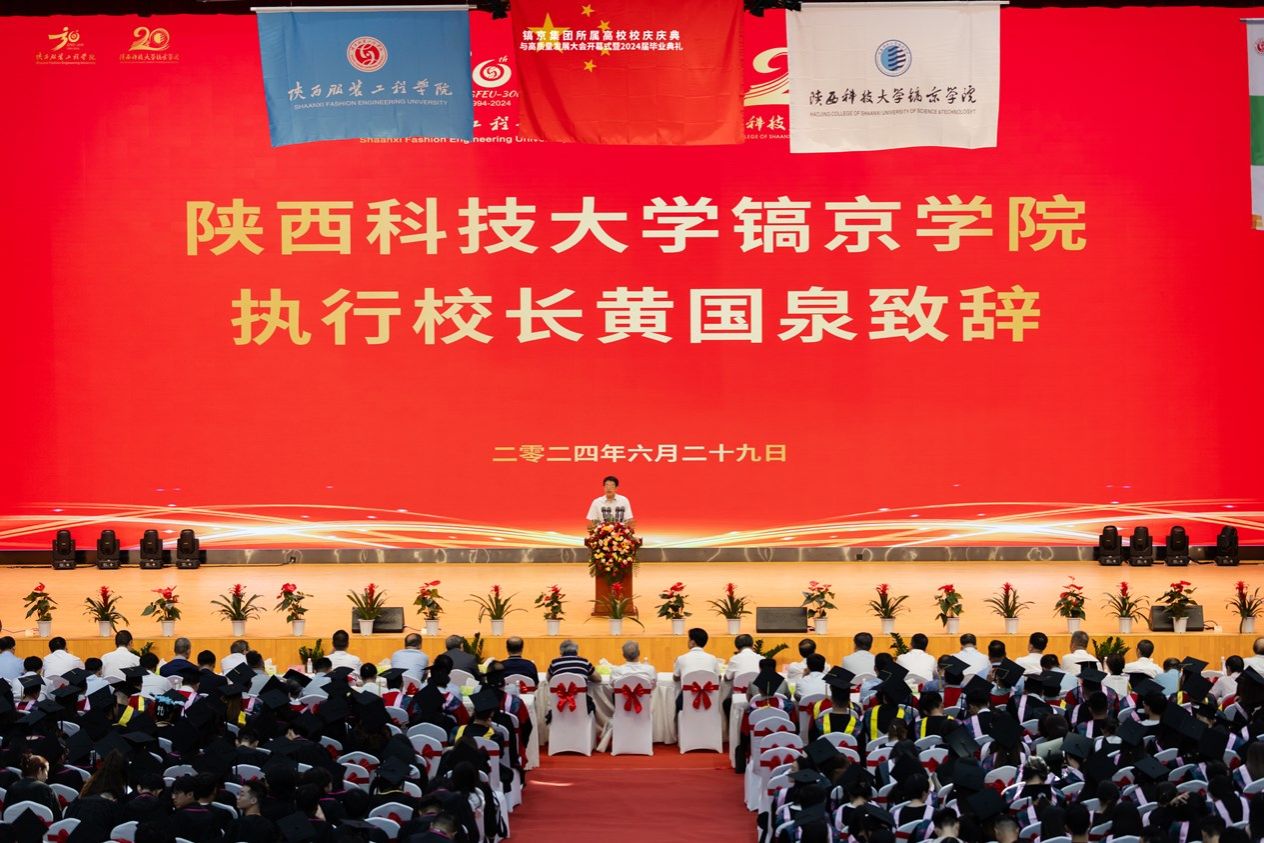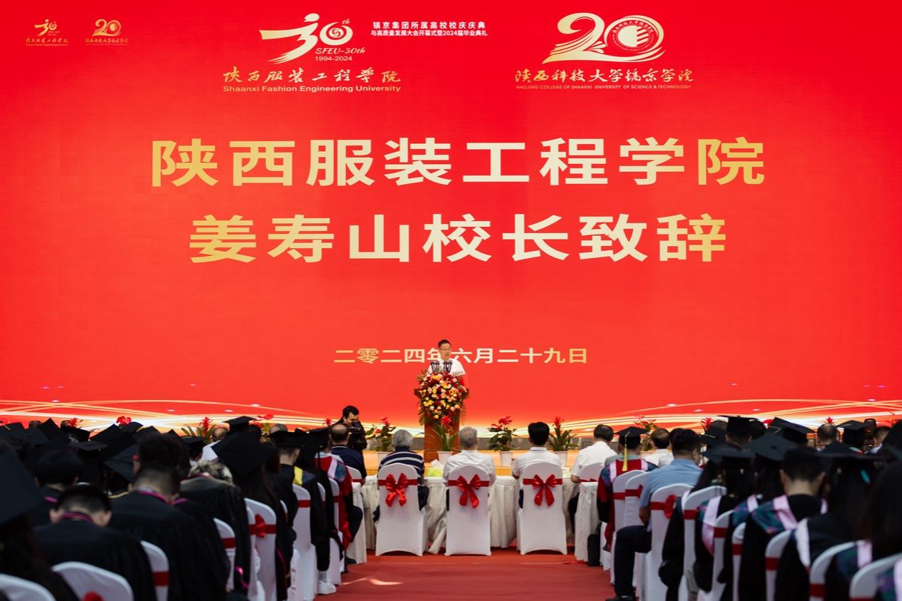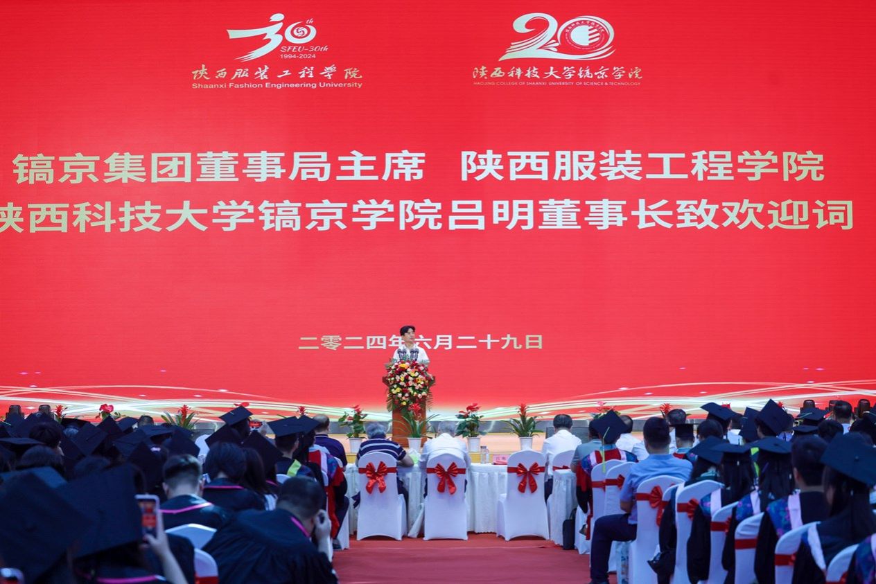 会上,镐京集团董事局主席、陕西服装工程学院董事长、陕西科技大学镐京学院董事长吕明博士致欢迎词,深情表达了陕服和镐京人艰苦创业、励志教育报国的家国情怀,为学校今后的发展描绘了宏伟的蓝图,极大鼓舞了全体师生的士气,振奋了精神,增强了两校高质量办学的自信。吕明博士指出:今天,我们在这里欢聚一堂,举办高质量发展大会,共同庆祝镐京集团陕西服装工程学院建校30周年,陕西科技大学镐京学院建校20周年,为中国共产党建党103周年献礼,在此,我谨代表镐京集团董事局和两校全体师生员工向所有来宾表示热烈的欢迎,向一直以来关心、支持学校发展的各级政府、各位领导、兄弟院校、合作企业、广大校友及社会各界人士表示衷心的感谢!向2024届全体毕业生,致以最美好的祝福!