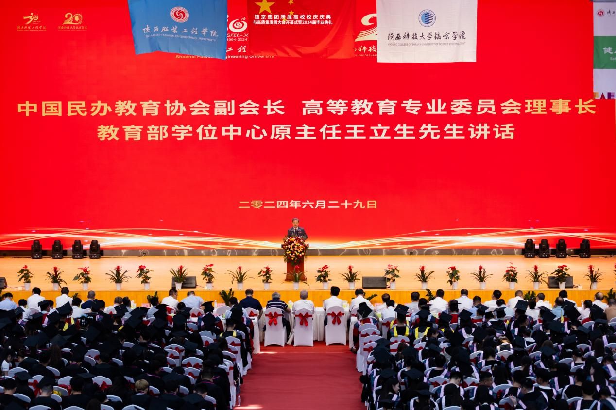 中国民办教育协会代表王立生衷心地祝愿学校越办越好,越办越强!他立足推动民办教育高质量发展,高屋建瓴对两所学校提出了五点要求和三点希望。一是两校要与公办高校一样,在新征程上担负起教育强国使命和责任。二是两校要进一步提高政治站位,全面落实党的领导,认真贯彻民办教育促进法及实施条例,坚持依法治校。三是立足应用型办学定位,坚持内涵发展,提高办学水平,勇做陕西乃至中国民办高校的排头兵。四是加强教学科研工作,不断改善办学条件,加快提升办学层次和空间。五是打造品牌,提升国内国际知名度,提升国际交流合作竞争力。一是希望陕西服装工程学院和镐京学院努力建设特色鲜明的应用型的高水平民办高校。二是希望教师们树立崇高的职业理想和科学的教育理念。三是希望同学们志存高远、刻苦学习、勇于探索,积极投身社会实践,成为高素质人才。