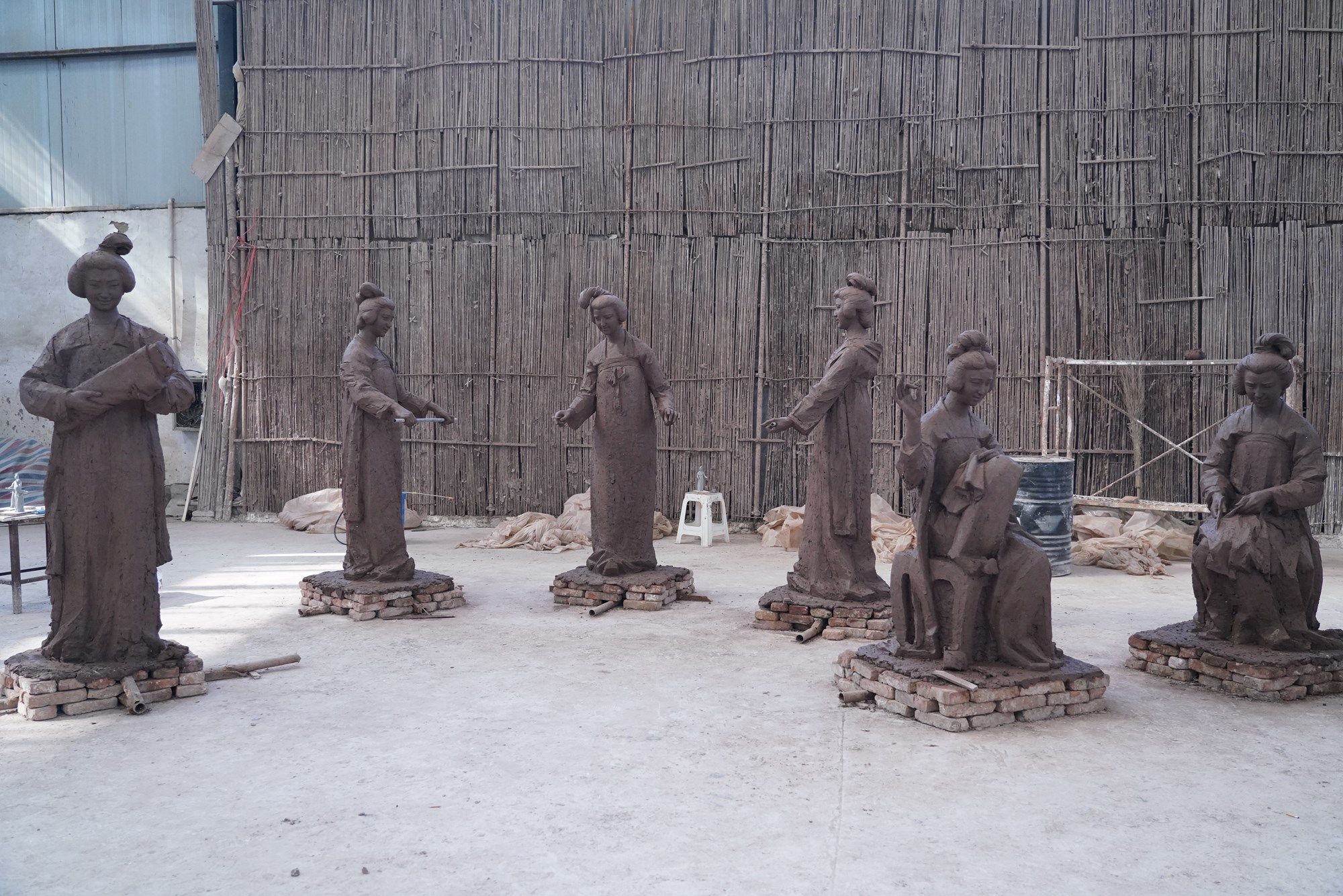 作品采用玻璃钢仿铜材质,真实再现古丝绸之路这一重大历史主题,体现东西方文化的交流与融合。站在雕塑前,我们仿佛看到,千年前,来往于东西方的商队,从我们的脚下大地出发,满载丝绸、瓷器、茶叶,一路驼铃声声,穿越万里黄沙戈壁,将人们等待已久的货物及商机带给远方。驼队由一组胡人牵驼、骆驼运货随行,唐家男儿骑马踏沙组成。为体现我校服装艺术办学特色和学科专业特点,根据唐朝相关记载,还精心设计了一组主题雕塑,雕塑群设计中共12人,女性10人,男性2人。艺术再现唐朝宫廷贵妇纺丝绸、织丝绸、裁丝绸、运丝绸的情景。群雕体现出浓浓的唐风,给人以强烈的视觉冲击力和心灵震撼感。