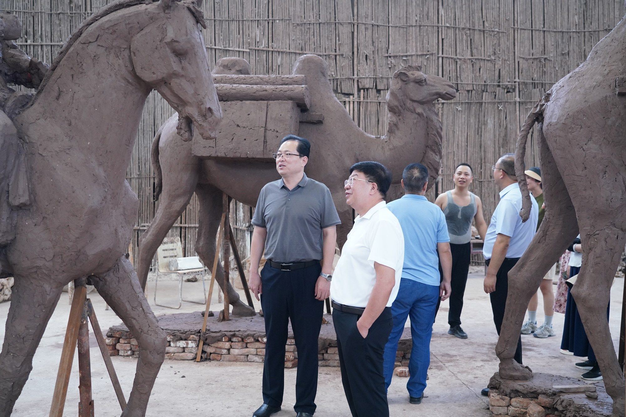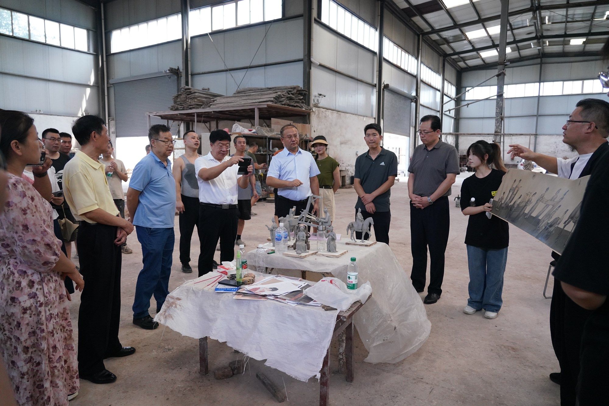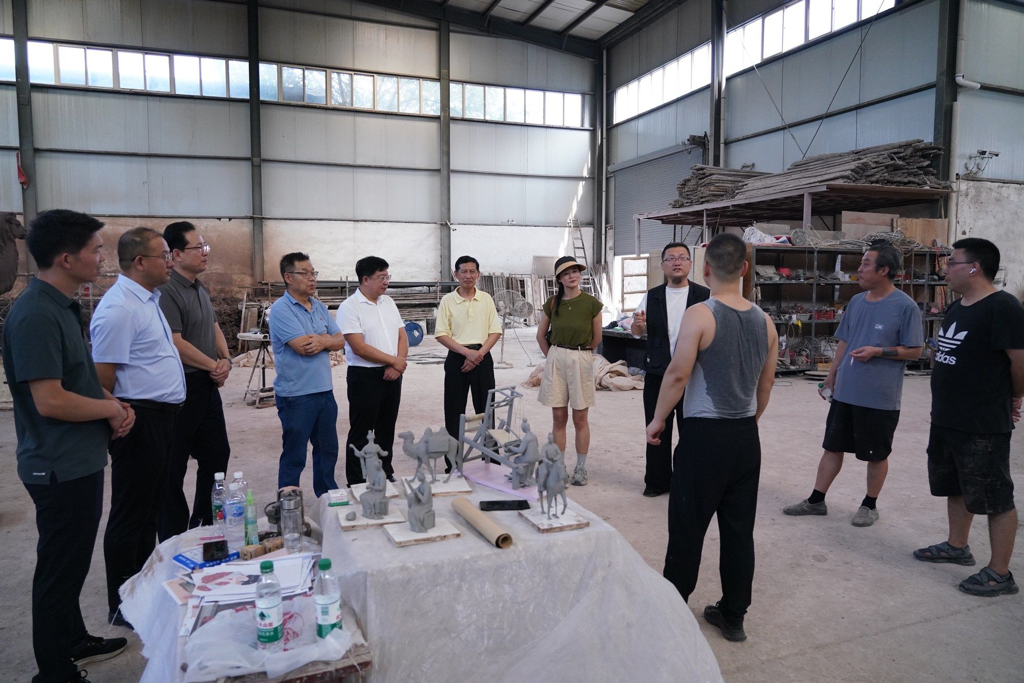 陕服新闻网讯(李文斌)8月28日下午,校长姜寿山、党委书记王岗、副校长潘庆才、党委副书记刘继兵等领导,深入长安区,实地督导调研丝路广场建设主题性雕塑“丝路循迹”设计制作进展情况。校工会、资产处、宣传部、艺术设计学院执行院长时晓楠及相关师生随同。