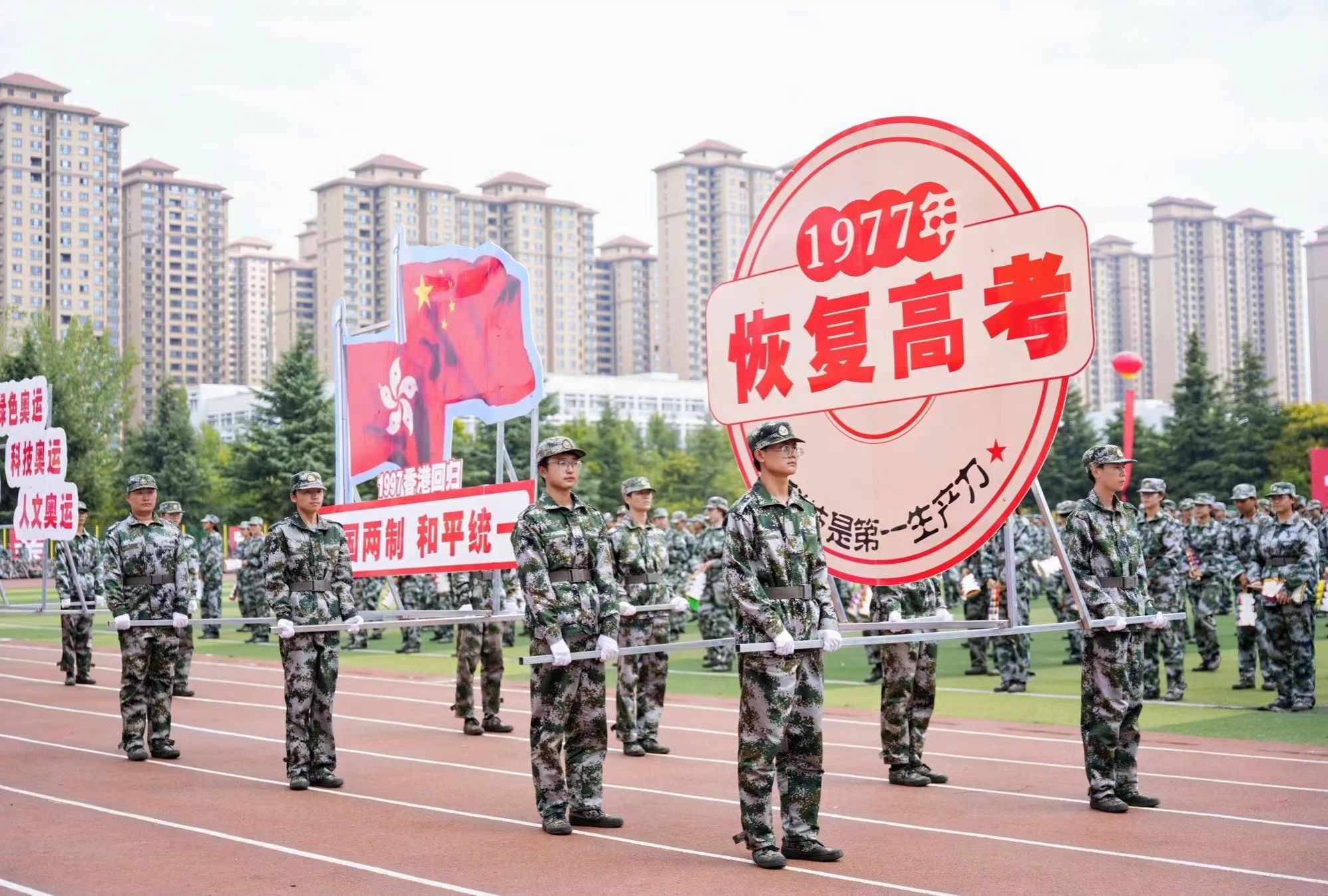 两校5700名新生,在国旗护卫队带领下,依次经过主席台,满身戎装的同学们精神抖擞,目光坚定,步伐整齐,精彩展示赢得全场师生阵阵掌声,随后进行了精彩纷呈的国防教育汇报表演。
