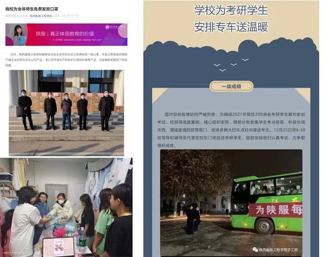 本轮疫情突发以来,陕西服装工程学院认真学习贯彻习近平总书记关于疫情防控工作的重要讲话和指示批示精神,按照省委教育工委、省教育厅部署,切实抓好学生疫情防控、思想政治教育、关心关爱帮扶等工作,努力为学生健康成长护航。