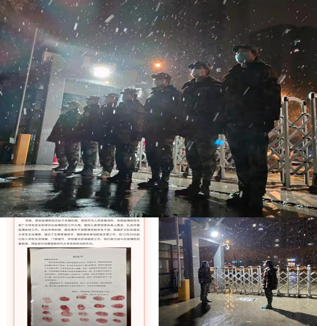 主动作为勇担当。按照学校统一部署,学工系统迅速建立起校院两级“联防联控”工作机制,多次进行专项研判部署,就学生工作存在的隐患和可能发生的突发问题进行预判和研讨,提前做好预案和各项工作部署,保障学生工作有序开展。通过网站、微信公众号、微信群、电话沟通等多种渠道,第一时间将学校通知和权威信息传递给每一位学生,做到信息全覆盖,在学生中普及防疫措施和常识,每日精准报送学生健康数据,做到学生疫情防控工作底数清、情况明、无死角、无盲区。疫情就是命令,坚持全体辅导员常年入住学生公寓这一传统的同时,从12月16日起,辅导员和学工干部放弃休息全部坚守一线,有两名辅导员为此推迟了婚期,有的辅导员将待产的妻子和年幼的孩子托付给家人,日夜陪伴在学生身边,召开线上会议教育引导学生,线下开展谈心交流,了解思想动态,关注心理健康,处理突发情况,全心全意为学生服务。实行“校、院、班、舍”四级网格化管理,明确工作任务、细化职责要求,充分发挥各级党组织、党支部的战斗堡垒作用,成立了由党团员、积极分子、团学干部、青干院、国旗护卫队、退役军人和志愿者组成的服务队,进行轮流值守,楼宇消杀,制作查验出入证,坚决保证学生公寓封闭式管理错时错峰代表外出取餐的要求落到实处;制定详细的全员核酸检测方案,完成了11轮核酸检测,学工干部和辅导员、志愿者全程参与组织,学生工作秩序井然,做到了应检尽检、不漏一人,排除了校内风险。