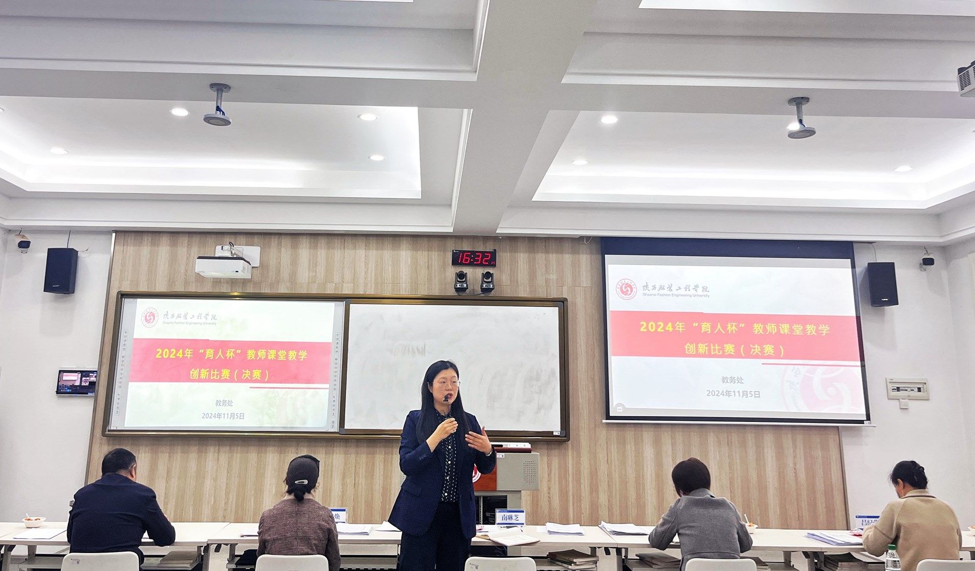 陕服新闻网讯(教务处)11月5日,我校在B208举行2024年“育人杯”教师课堂教学创新大赛决赛。大赛评委由校内外知名专家教授杨生博教授、胡鸣焕教授、张雪玲教授、李国瑞教授、任伯虎副教授、南琳芝副教授、吕纪荣副教授担任。艺术设计学院教师高岚主持大赛。