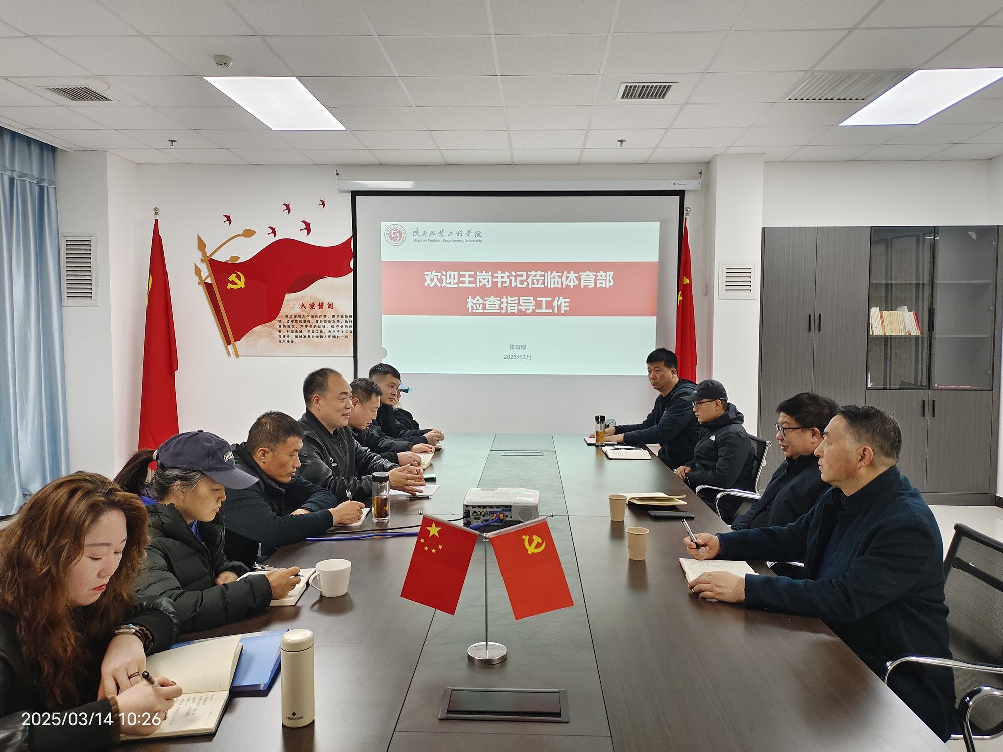 陕服新闻网讯(体育部)3月14日上午,党委书记王岗到体育部调研,听取体育部以体育人工作情况汇报、实地检查体育部校园文化墙建设及体育场馆使用管理等情况,就进一步加强思想政治引领、发挥体育部在以体育人方面的作用、大力开展阳光体育运动提出指导意见。党委工作部部长伍建成随同调研。