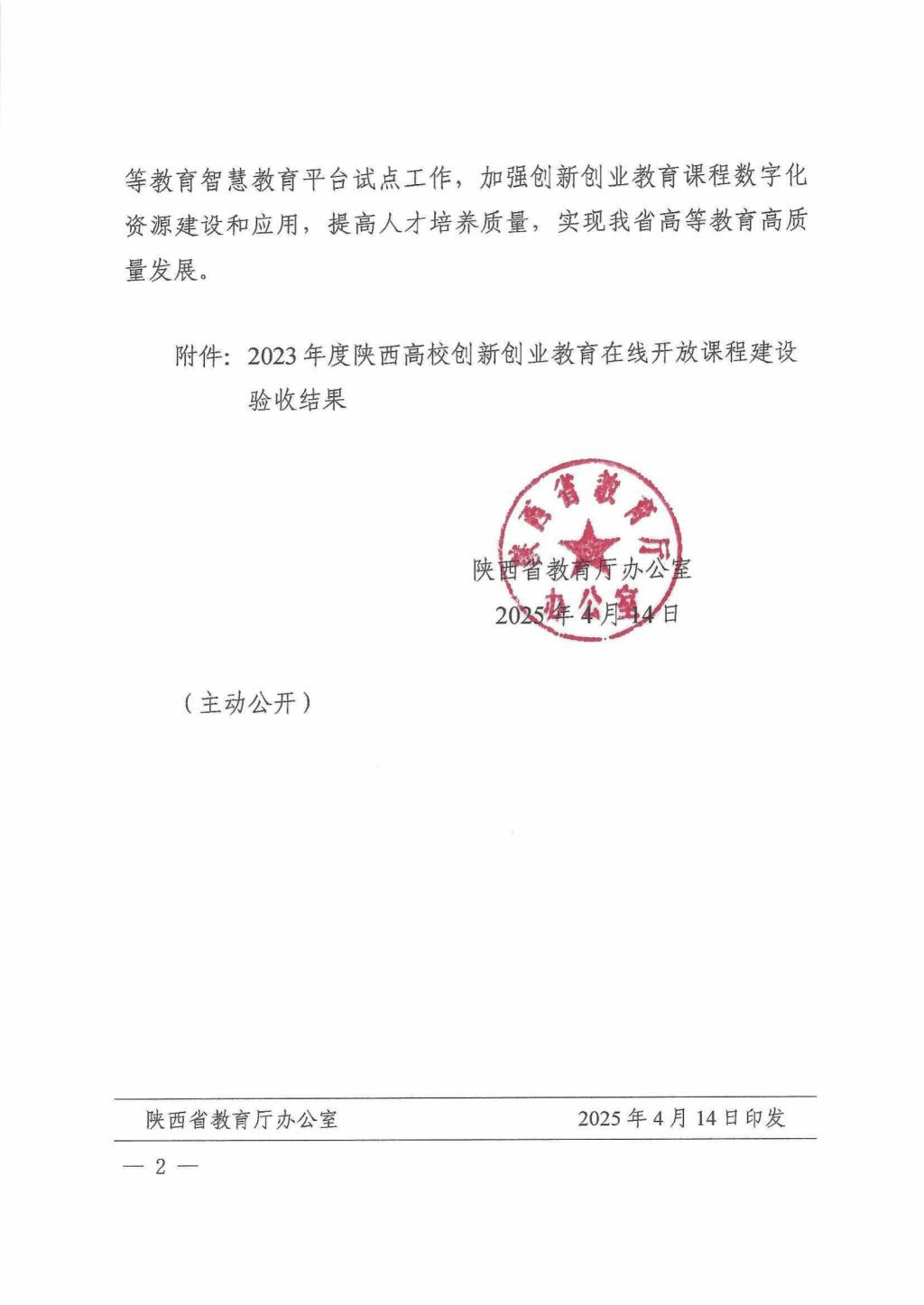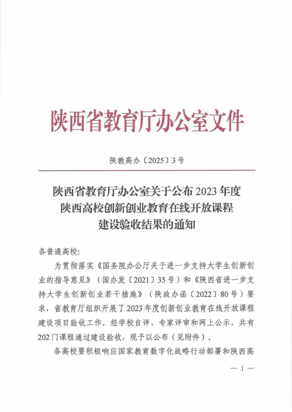 陕服新闻网讯(教务处)近日,陕西省教育厅办公室发布了《关于公布2023年度陕西高校创新创业教育在线开放课程建设验收结果的通知》(陕教高办[2025]3号),经学校自评、专家评审和网上公示,我校两门创新创业教育在线开放课程通过验收。