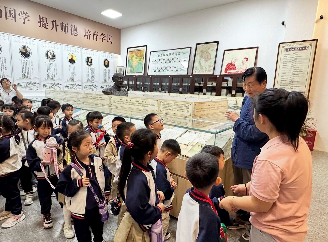 当小朋友们来到季羡林特藏室时,他们踮着脚尖,睁着亮晶晶的眼睛,好奇地观察玻璃展柜中的手稿,轻轻触摸着展牌,仿佛在与历史对话。特藏室负责人郭老师用童趣化的语言向孩子们介绍季羡林先生求学治学的经历:“季爷爷是一位超级厉害的大学问家,他会很多很多种语言,就像童话里的‘魔法翻译家’。” 当听到季羡林先生热爱祖国、爱书如命的故事时,小朋友们纷纷表示要像季爷爷一样,做一个爱祖国、爱读书的好孩子。