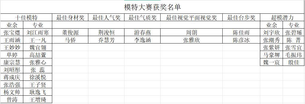 经过紧张激烈的角逐和专业评委的公正评审,最终评选出十佳模特(专业10人/业余10人)五个单项奖:最佳台步奖、最佳平面视觉奖、最佳气质奖、最佳人气奖、最佳身材奖(专业5人/业余5人)、超模潜力奖(专业5人/业余5人)。获奖名单如下: