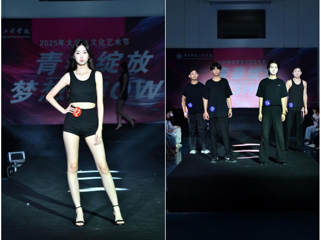 陕服新闻网讯(服装学院)作为陕西服装工程学院2025年大学生文化艺术节重磅活动之一,备受瞩目的校园模特大赛决赛于6月5日晚在A区T台精彩上演。经过层层选拔脱颖而出的50位优秀选手同台竞艺,为现场师生及线上观众献上了一场融合时尚、艺术与青春活力的视听盛宴。本次大赛由校团委主办,服装学院承办。